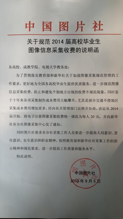 3.关于图像采集费的交纳方式上,根据吉林省教育厅通知精神,本次图像采集费由承担采集任务的新华社吉林分社现场收取。收费标准沿袭中国图片社《关于规范2014届高校毕业生图像信息采集收费的说明函》(附件五)的要求,采集费用每人20元。为便于现场收取,请学生一定提前备好零钱。