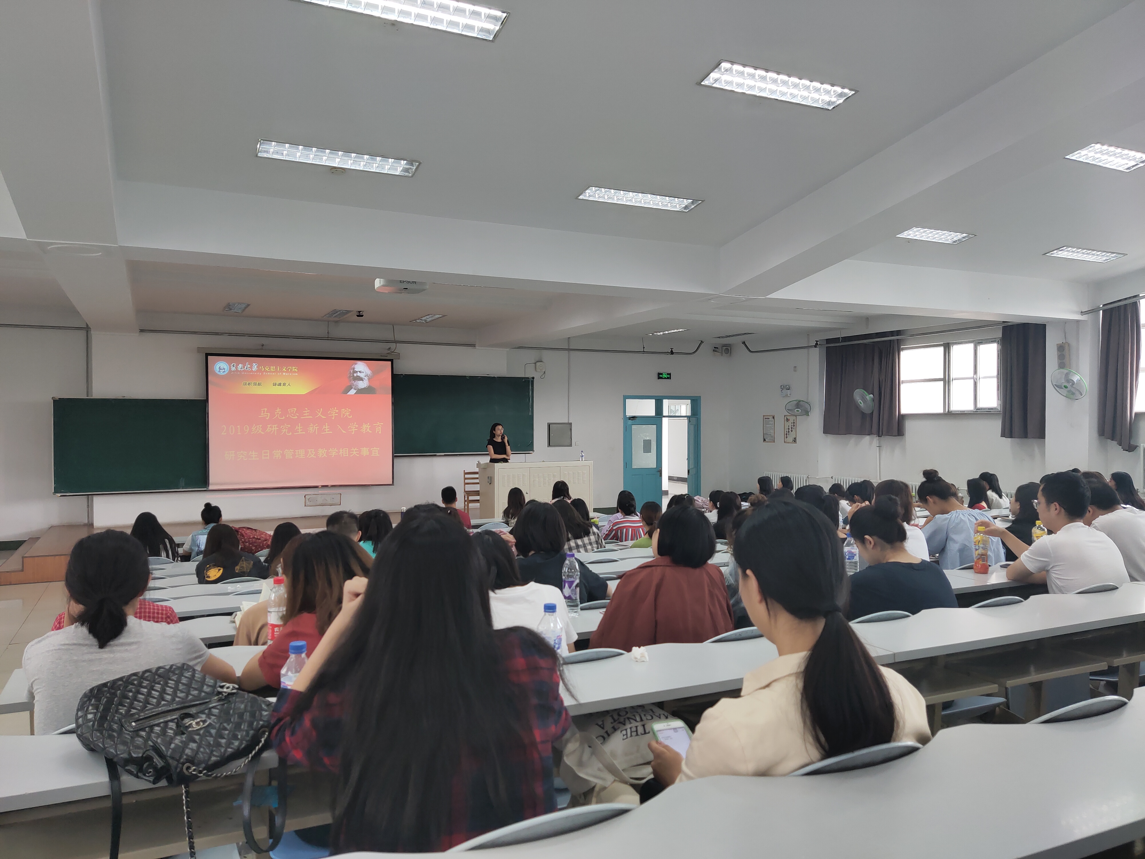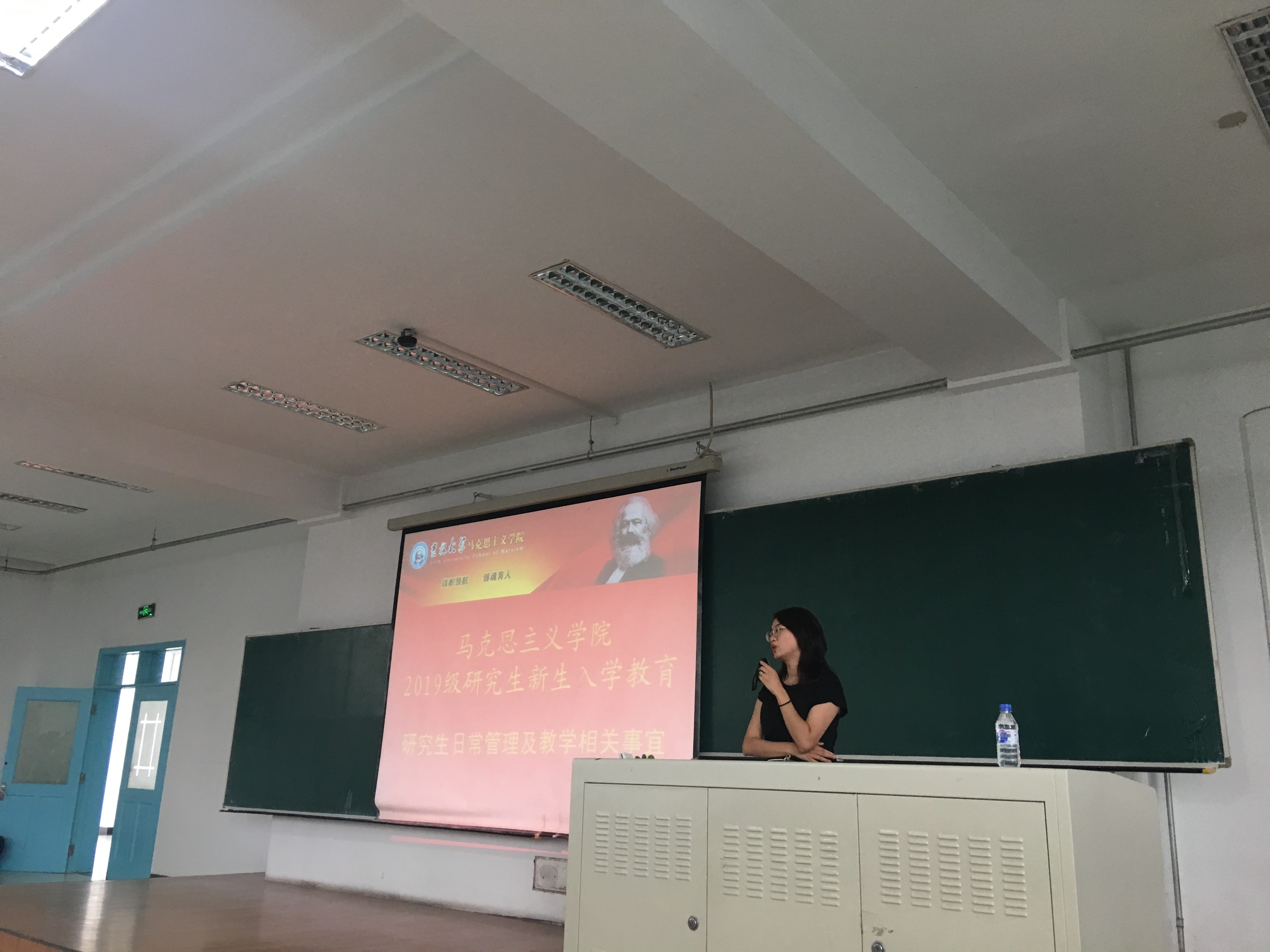 团委书记万佳悦老师在中心校区第三教学楼第九阶梯教室为新生讲解研究生日常管理及教学相关事宜。