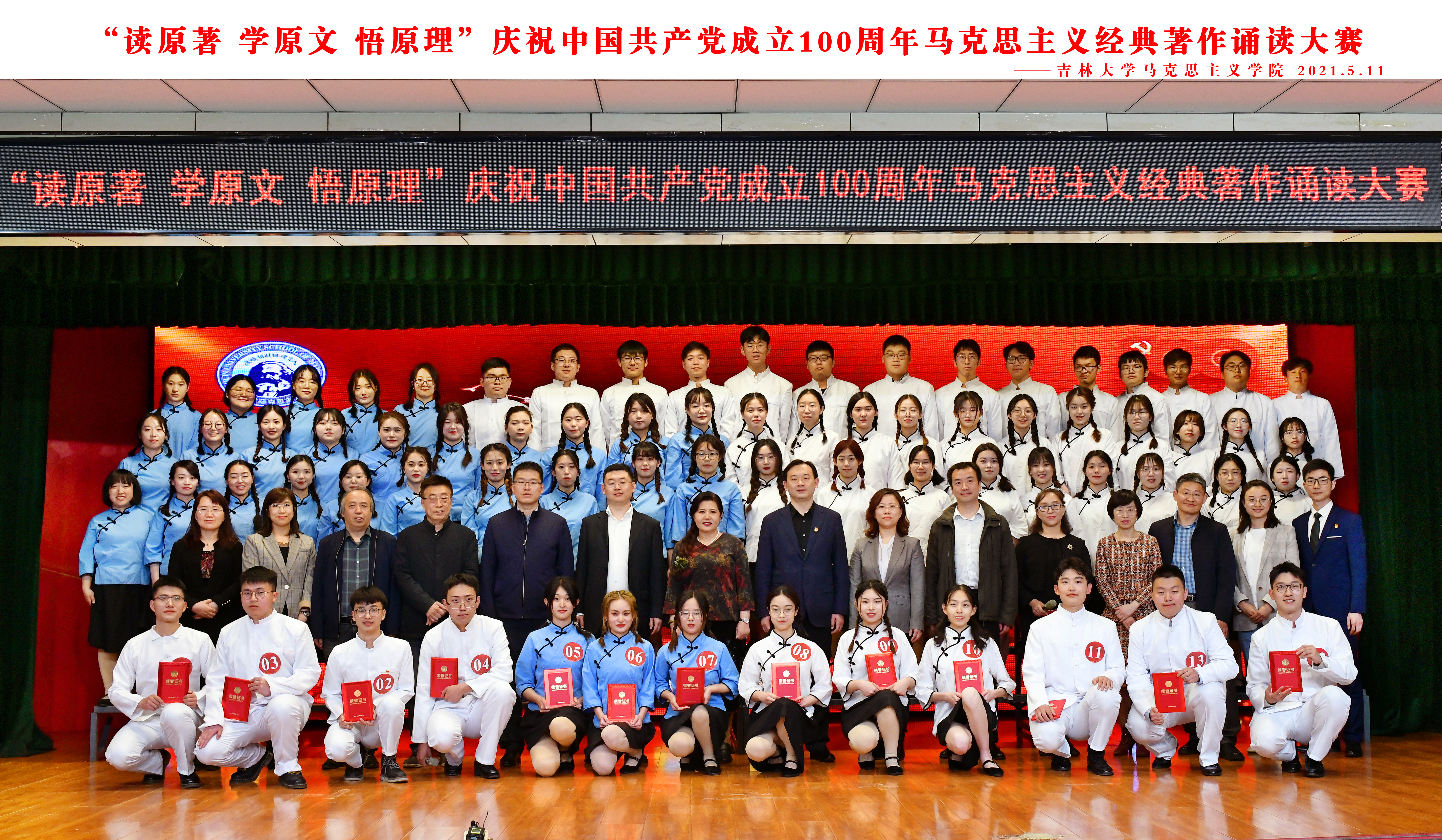 比赛结束,马克思主义基本原理方向学科带头人穆艳杰教授对学生诵读比赛进行了专业点评。穆教授说:今年是中国共产党成立100周年,100年峥嵘岁月,100年波澜壮阔。从历史和现实可以看出,在中国共产党100年的奋斗历程中,凡是把马克思主义与中国实际紧密结合的时期,我们的事业取得胜利;凡是马克思主义脱离中国实际的时期,我们的事业就遭受挫折。历史是最好的教科书。作为马克思主义理论学科的学生,对马克思主义经典著作烂熟于心是一名马克思主义研究者的基本功。他最后谆谆教导学生要夯实马克思主义理论基本功,在未来的学术发展道路上才能厚积薄发。点评之后是颁奖仪式,评委投票评选出一、二、三等奖。学院为同学们准备了《列宁专题文选》《毛泽东选集》《邓小平选》作为奖品。最后,学校和学院相关领导同全体参赛73名学生合影留念,比赛在《没有共产党就没有新中国》的奏唱中圆满结束。