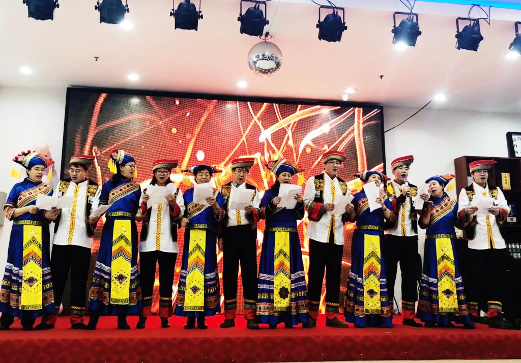 行政人员亲如一家的深厚情感;概论教研室的大合唱《团结就是力量》刚劲有力,表现出马院教师团结一致迎接美好明天的决心;原理教研室杨洪兴老师在联欢会上为大家带来原创诗歌朗诵《新时代的英雄》,文采飞扬、情真意切。此外,形势与政策教研室、研究生教研室分别带来原创三句半,诙谐幽默,引得大家叫好声不断。退休教师庞雅莉和邓如辛也分别带来《彩绸舞》和笛子独奏《大海航行靠舵手》。在丰富多彩的节目中,还穿插着抽奖环节和游戏环节,大家笑声不停,掌声不断,场面非常热烈。最终,联欢会在纲要教研室的大歌唱《歌唱祖国》中落下帷幕。