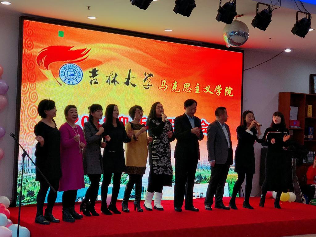 联欢会在优美的歌伴舞《国家》中拉开帷幕。联欢会上,学院七个教研室近百位老师及研究生、本科生共同参演,节目形式多样,精彩纷呈,老师们和同学们用不同的方式表达对新年的祝福。概论教研室的诗朗诵《我爱你中国》饱含深情,表达了马院教师对祖国的深切感情;形势与政策教研室的合唱《相逢是首歌》歌声婉转,展示了老师们真挚的情谊;行政办公室兰去非一支《惊鸿舞》优雅飘逸、引人入胜;基础教研室大合唱《外婆的澎湖湾》曲调优美,使观众在轻快的节奏中回忆起童年时光;研究生教研室盛装合唱《阿瓦人民唱新歌》,极具民族特色,气势恢宏;副院长吴宏政一曲吉他弹唱《外面的世界》引发全场合唱,将联欢会推向高潮;行政办公室的老师为大家带来歌曲串烧《相亲相爱》,携手展现Hentaimama