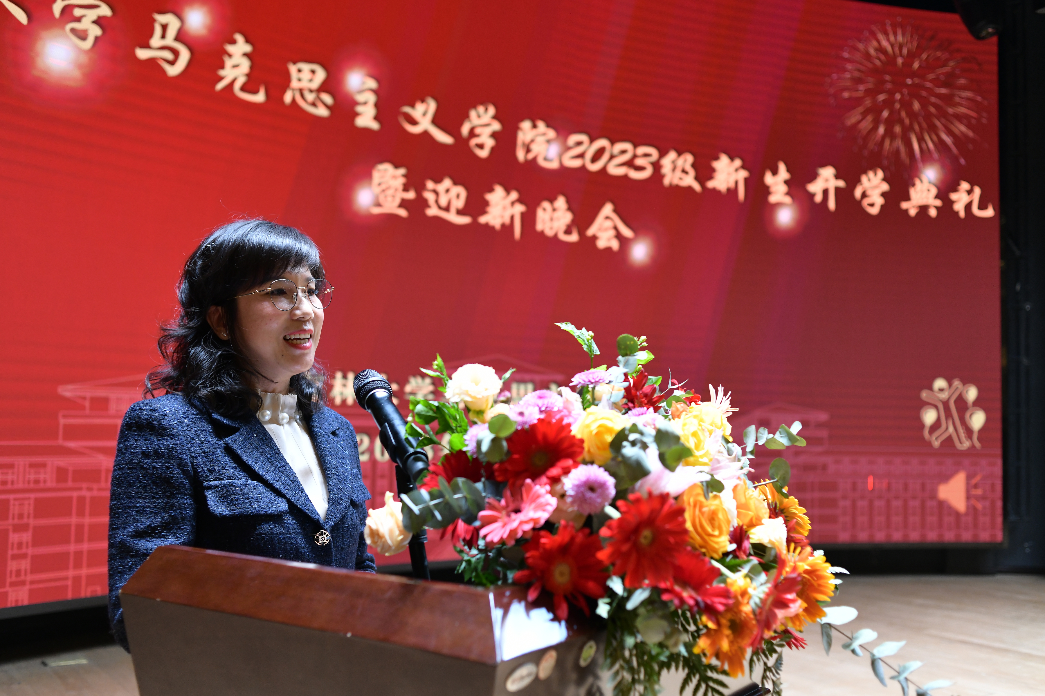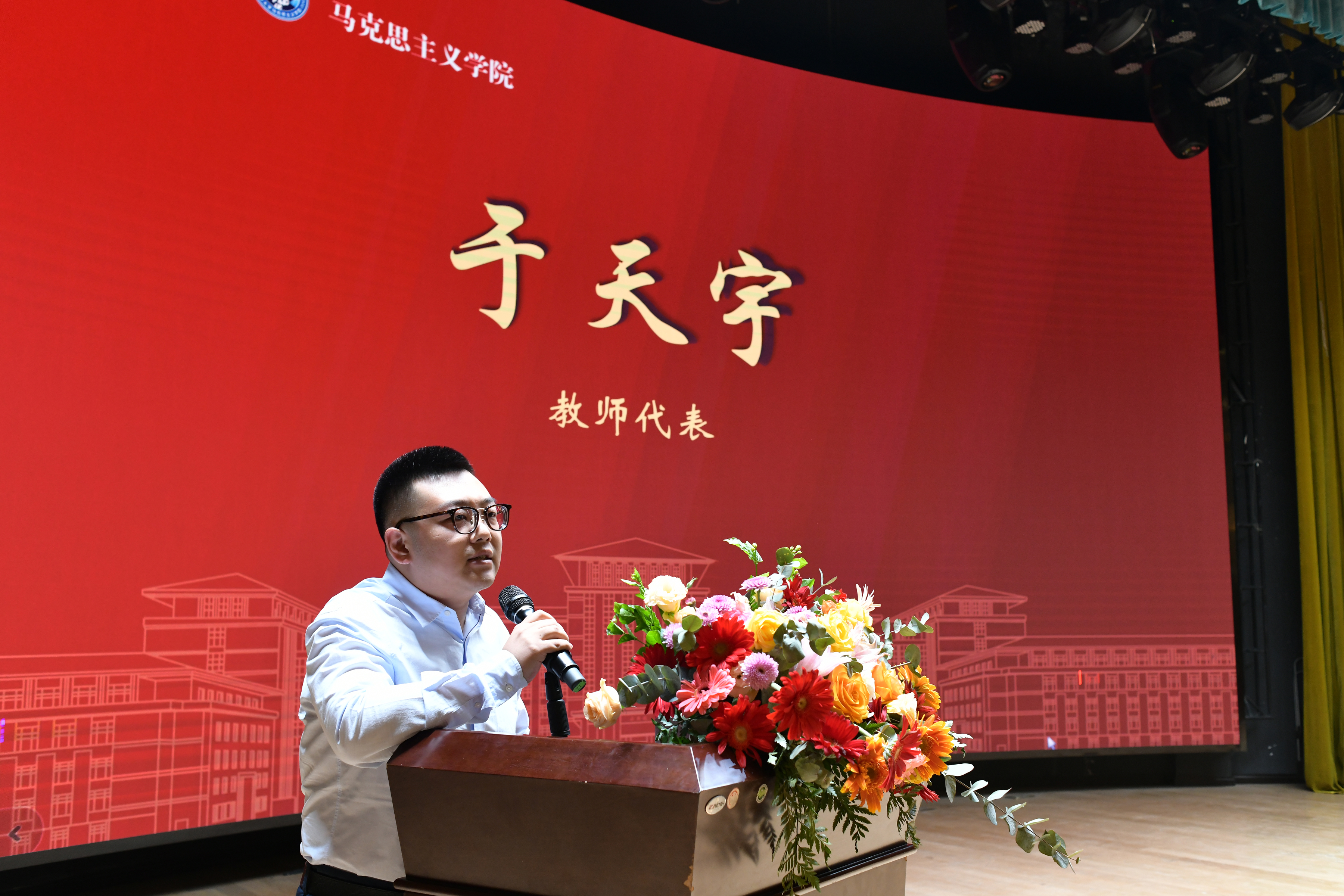 接下来,国家“万人计划”青年拔尖人才、吉林省高校优秀人文社科青年科研创新人才于天宇教授作为学院教师代表发言。于天宇向新生同学提出了三点殷切嘱托:珍惜时间、热爱生活、努力学习。希望同学们可以通过吉大马院这个优秀的平台迈上人生的新境界,扬鞭脚下,踏梦而行,不负韶华。