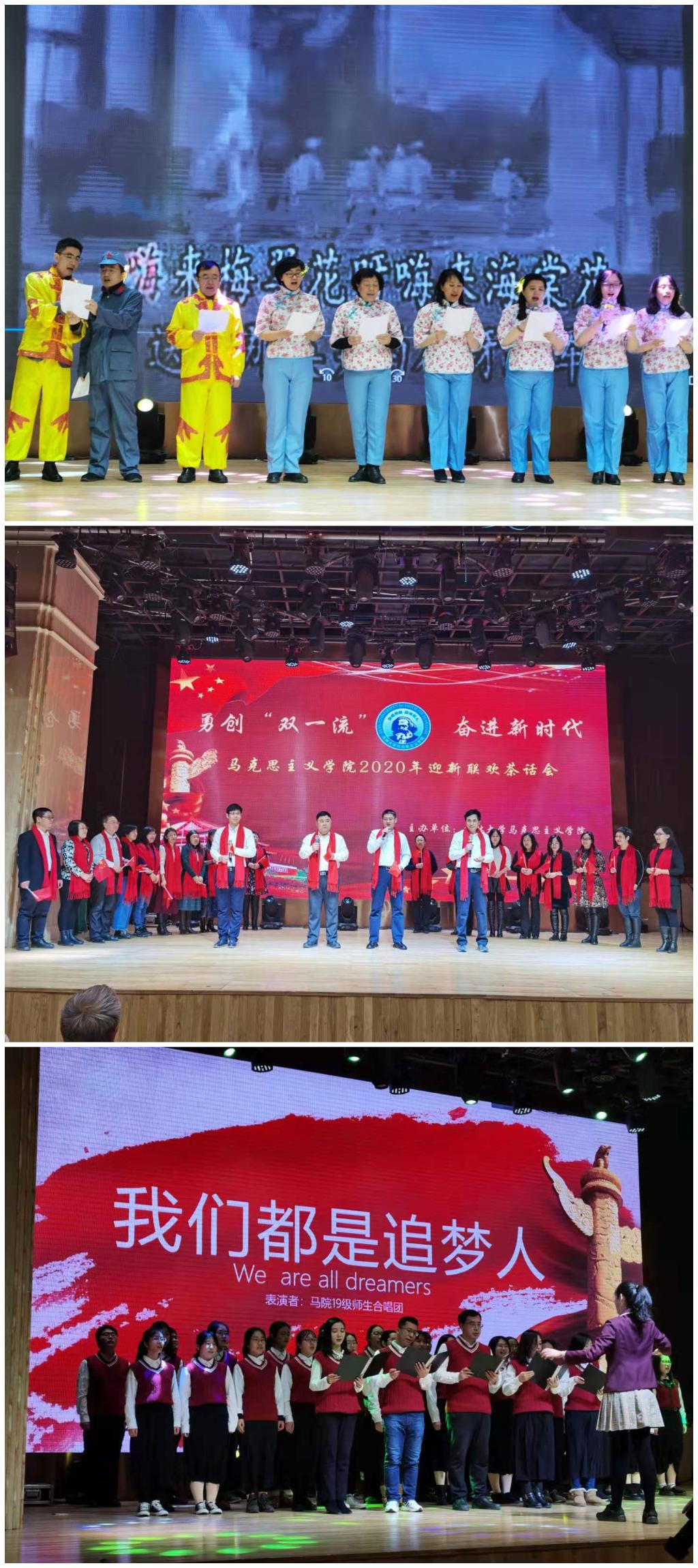的老师们不忘初心,牢记使命,以伟人的初心,化作马院人永恒的精神!当基础教研室气吞山河的三句半联唱《我和我的祖国》响起,全场掌声不断,歌曲唱出了我们万众一心、催人奋进的时代赞歌,凝聚了老师们深深的爱国之情;思想政治教育专业全体师生演唱了《我们都是追梦人》,歌曲激励着每一个人发扬梦想精神,继续在奔跑中拥抱梦想、成就梦想,在奔跑中奋力逐梦,做新时代的追梦人!