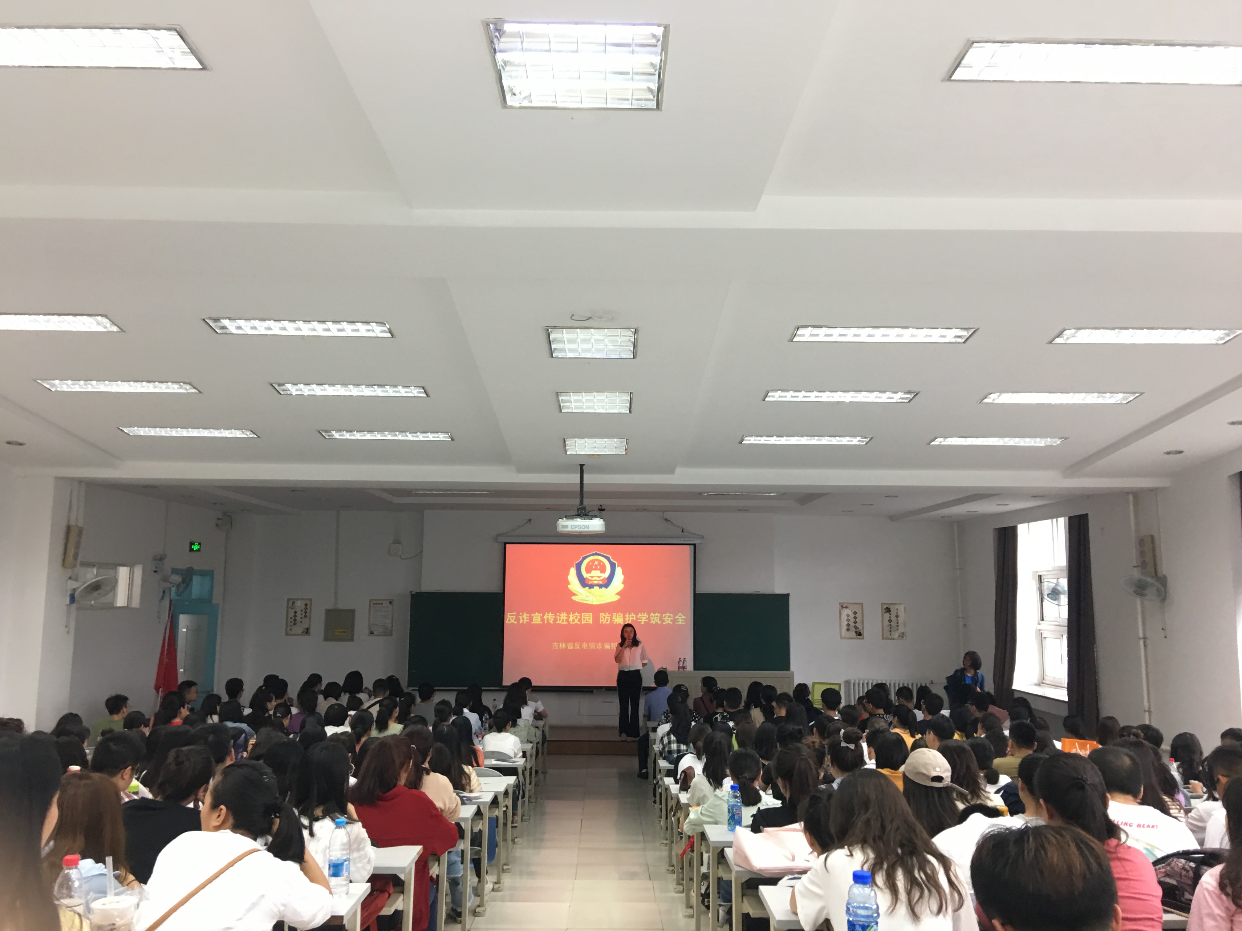 首先,于警官向同学们详细讲解了什么是电信诈骗,主要介绍了电信诈骗的类别、来源及危害,并穿插着鲜活的现实案例以示警醒,使同学们对电信诈骗有更加深刻认识,并时刻保持防范意识。接着,于警官还与现场同学进行了防网络诈骗知识问答互动。于警官向每位同学发放了宣传手册及徽章,并给予正确回答提问的同学以特色马克杯奖励纪念。最后,吉林省通信管理局工作人员还向同学们详细介绍和宣传了电话用户实名制及其对防范电信网络诈骗的重要性。