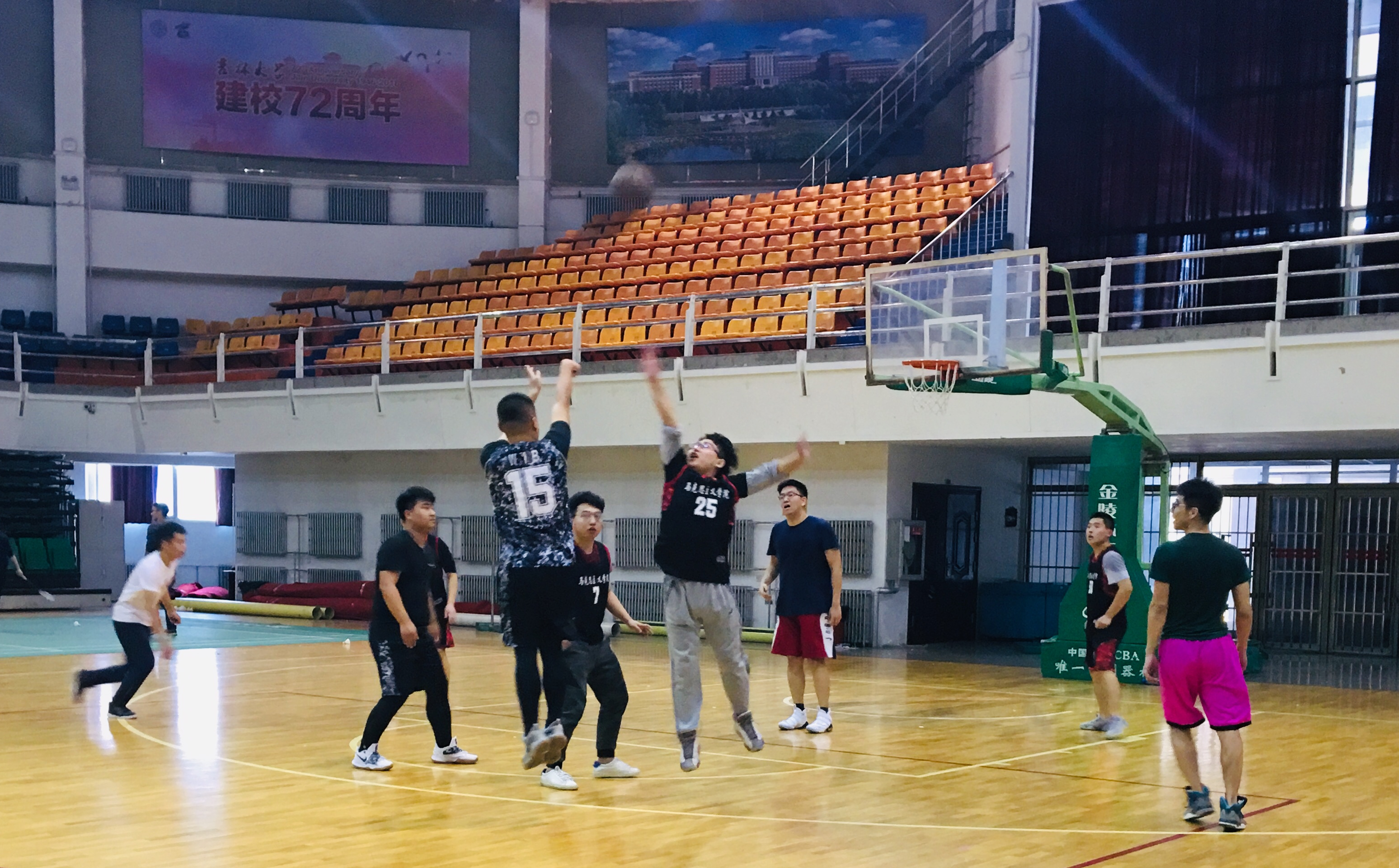 研究生篮球友谊赛在中心校区体育馆拉开了帷幕。本次比赛共分为2支参赛队伍,分别为研二研三代表队和研一代表队,是一场研一新生们与研二研三的学长们的篮球友谊赛的较量。篮球场上还聚集了学院各年级各班的观众同学以及热情洋溢的啦啦队。