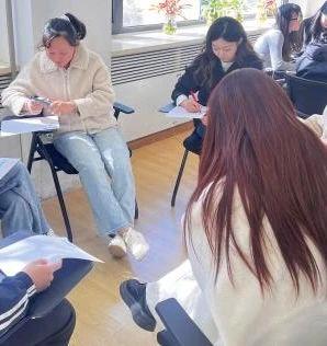 活动伊始,学生朋辈心理辅导员杨蕙嘉总体上介绍了本次心理团辅活动的主题、目标与大致流程,并希望同学们通过全身心的感受和投入,从中获得内在满足和珍贵友情。随后活动开始,现场采取报数方式进行随机分组,以小组为单位进入“我知道”的游戏环节。同小组同学围坐在一起,讨论朋辈给出的话题并进行扩充,大家从自己的名字含义、家乡美食到爱好特长再到新学期的体验感受,使同学们关注自己的同时也关注了他人,活跃了现场气氛,增强了团体成员间的熟识。