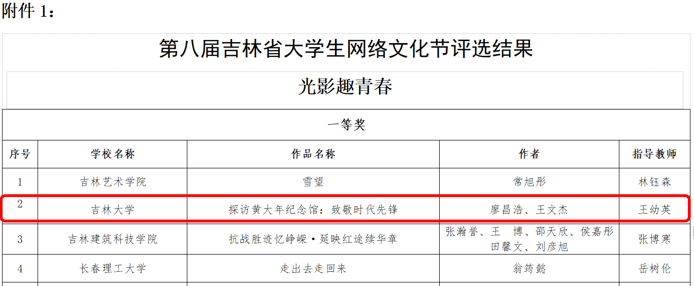 廖昌浩、王文杰同学共创作品《探访黄大年纪念馆:致敬时代先锋》荣获第八届吉林省大学生网络文化节“光影趣青春”一等奖。