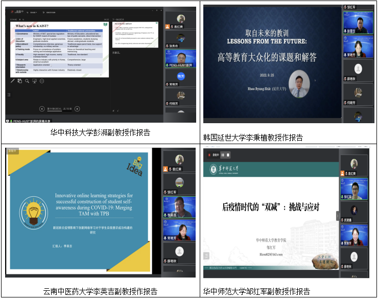 常艳芳教授主持。大连理工大学何晓芳教授针对中国高校智库建设困境,在智库定位与功能、学科战略、评价手段、管理创新四个维度探讨了高校智库建设出路。韩国中源大学全春莲教授以国际教育认证制度为中心,介绍了韩国教育国际化的政策变迁。华中科技大学彭湃教授通过梳理新型研究型大学韩国科学技术院的发展,指出我国新型研究型大学建设需要从办学自主权和开放式治理等方面着力。河南大学张务农教授深入分析了高校教师学术评价科学化的是与非,并指出科学评价只能描述已有学术成果的创新性,但很难预知潜在的创新。陕西科技大学武建鑫教授论述了新型研究型大学的政策指向与发展路径,强调基于政策话语和办学实践诉求的新型研究型大学,并非只是中国高等教育独有问题,只有扎根本土才能面向未来和世界。华中师范大学教育学院邹红军教授针对后疫情时代双减面临的现实问题,在家庭教育、线上培训监管机制、在线教育资源三方面提出了新思考。云南中医药李英吉教授分享新冠肺炎疫情影响下创新网络学习对于学生自我意识成功构建的实证研究,指出课程质量和结构化学习可以确保积极的学习成果。广州城建职业技术学院薛艳秋教授通过比较产教融合背景下中韩高职院校发展特色与实践策略,呼吁我国高职教育应树立科学的教育理念,加强产教融合。韩国延世大学教育学院李秉植(Rhee Byung Shik)教授分享了高校外籍教师的国际间跨境流动研究。