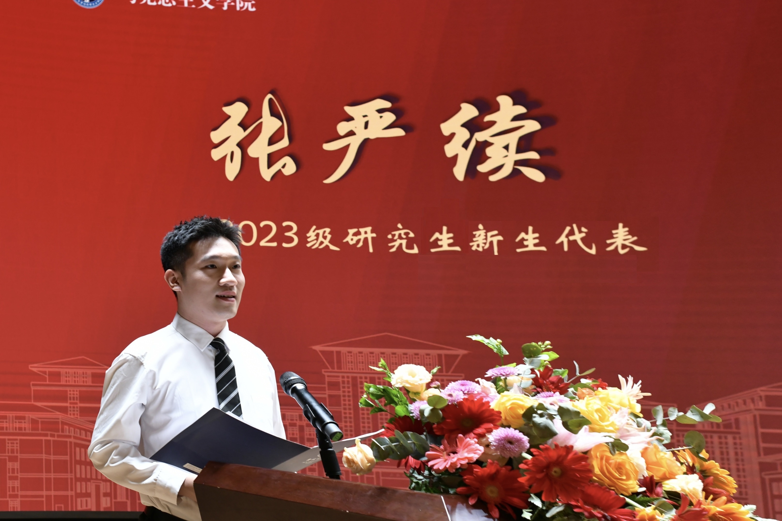 接下来,国家“万人计划”青年拔尖人才、吉林省高校优秀人文社科青年科研创新人才于天宇教授作为学院教师代表发言。于天宇向新生同学提出了三点殷切嘱托:珍惜时间、热爱生活、努力学习。希望同学们可以通过吉大马院这个优秀的平台迈上人生的新境界,扬鞭脚下,踏梦而行,不负韶华。
