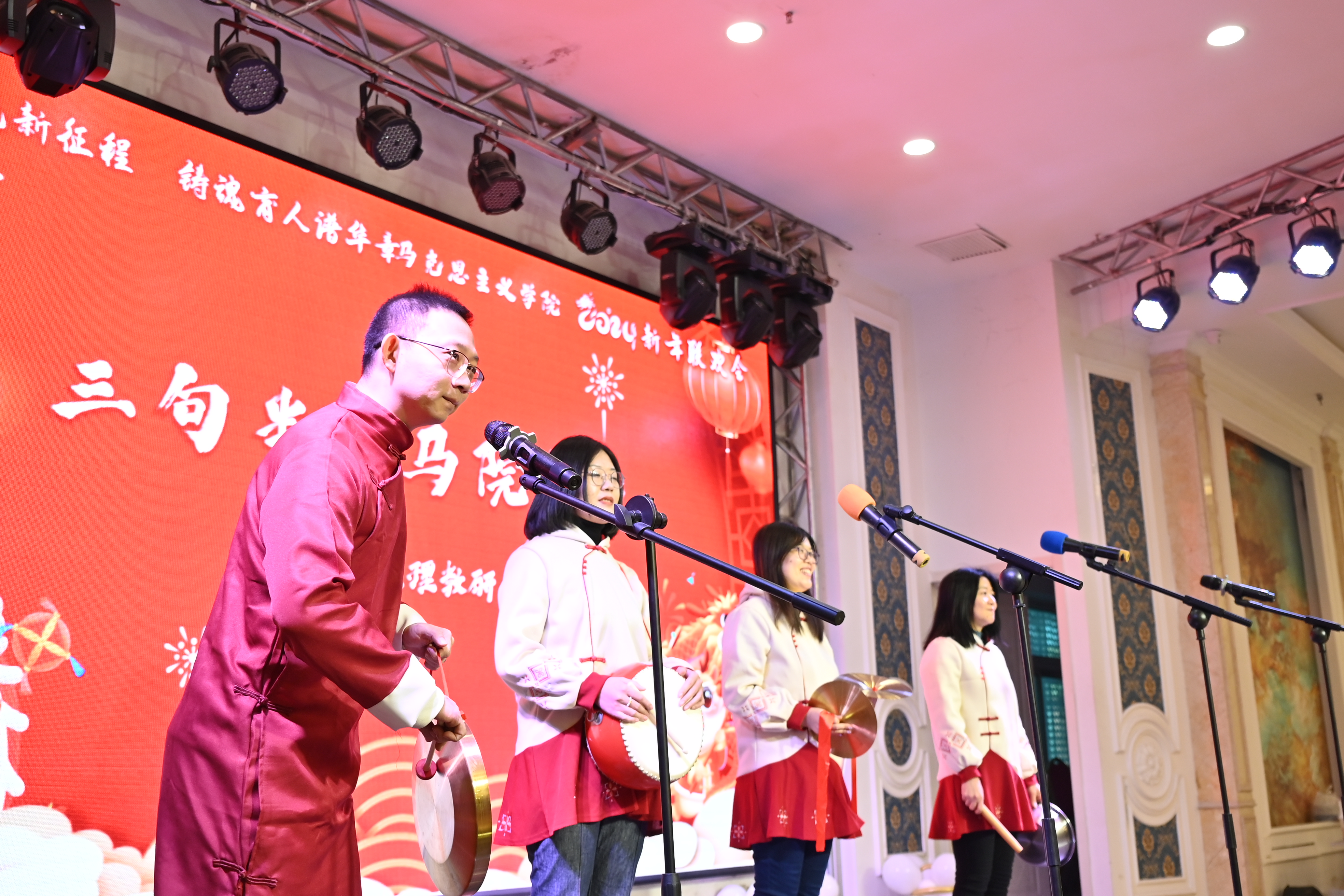 联欢会在形势与政策教研室带来的《相逢是首歌》中正式拉开帷幕,悠扬绵长的曲调和细腻动情的演绎徐徐讲述着奋斗与传承的初心使命;马克思主义基本原理教研室的老师们带来了精彩绝伦的三句半《马院能》,带来欢乐的同时也饱含对Hentaimama