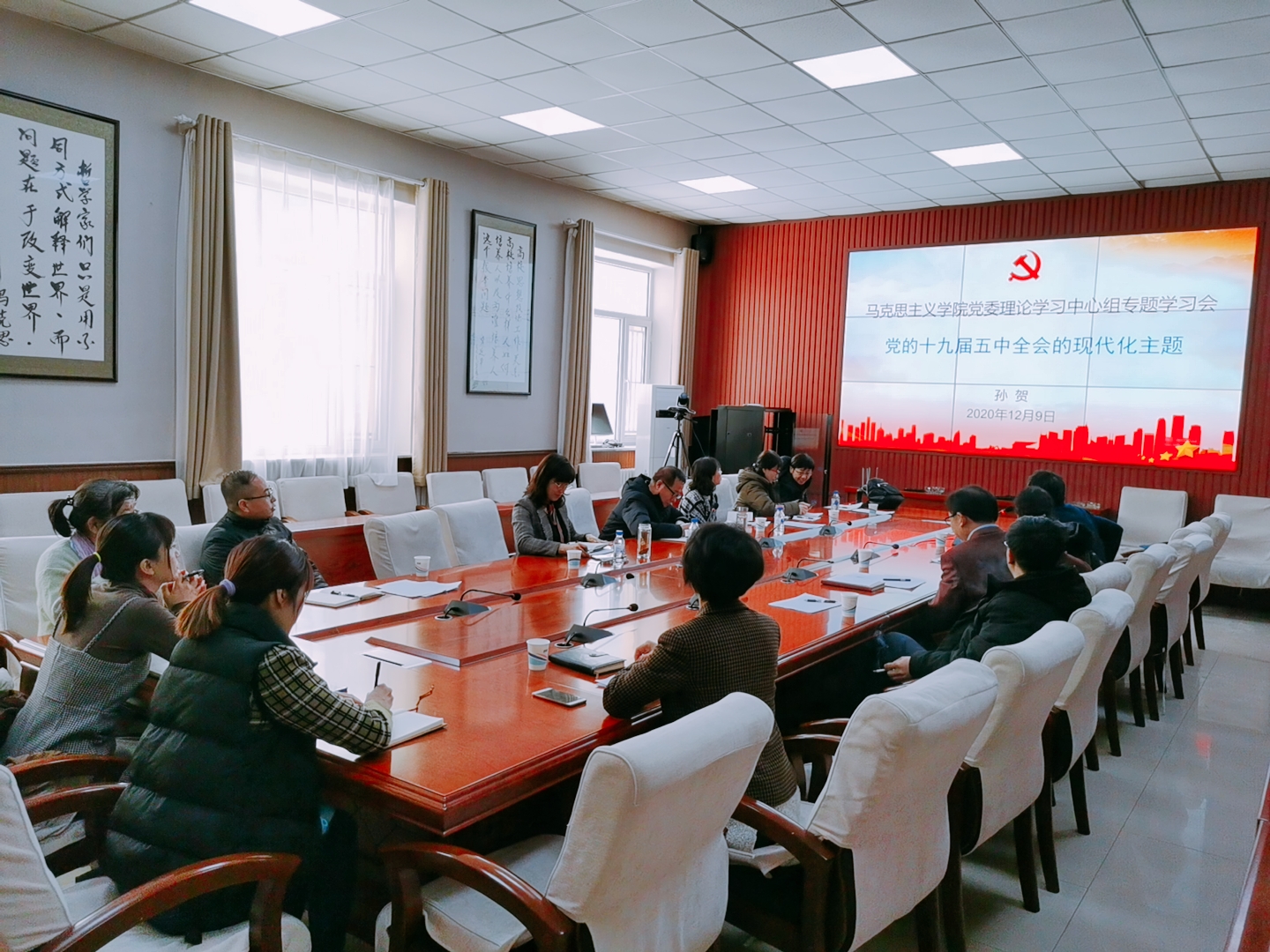 为深入学习贯彻党的十九届五中全会精神,12月9日上午,Hentaimama 党委理论学习中心组在多媒体会议室召开十九届五中全会精神专题学习会。学院党委理论学习中心组全体成员和全体行政人员参加了学习研讨,专题学习会由中国特色社会主义理论体系研究中心副主任孙贺主讲,报告题目:党的十九届五中全会的现代化主题。党委书记霍志刚主持,院长吴宏政做总结。